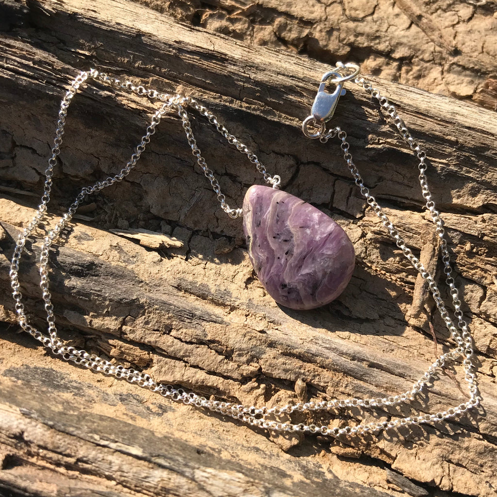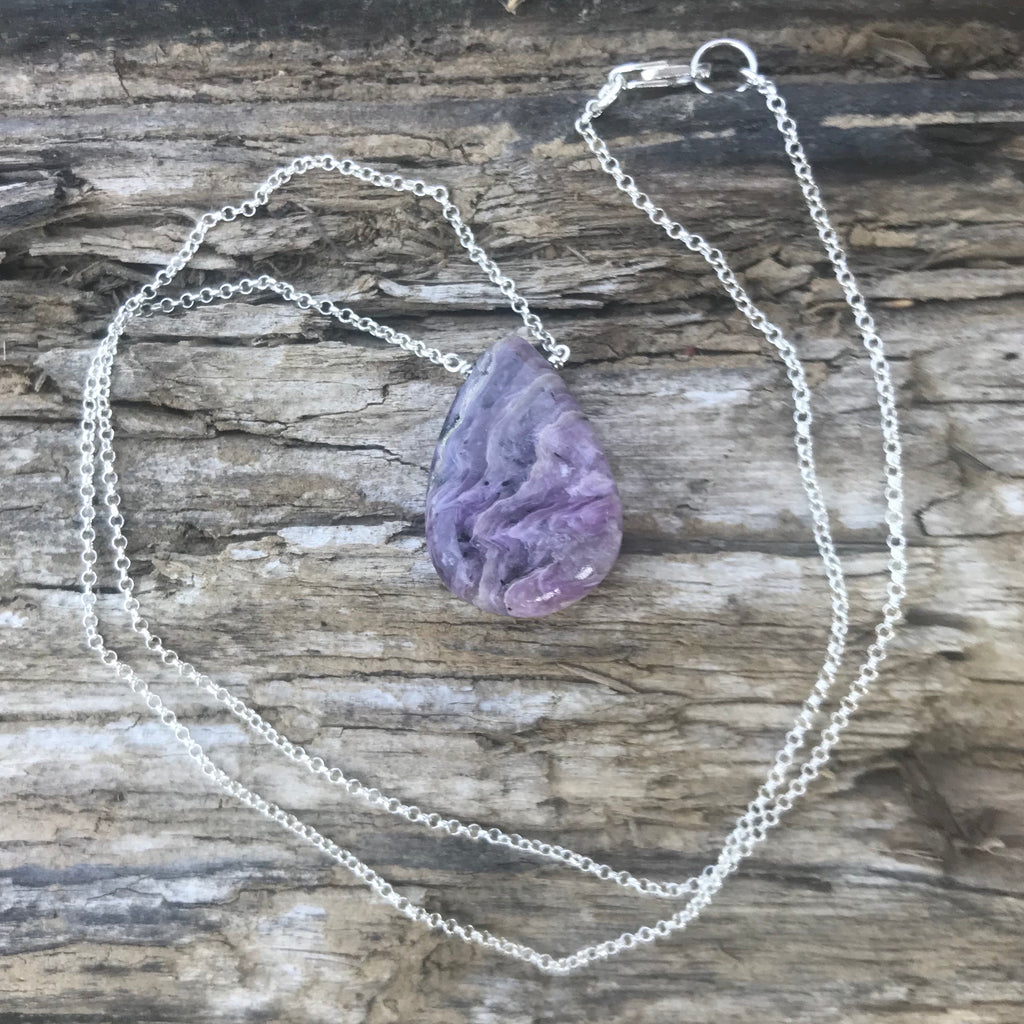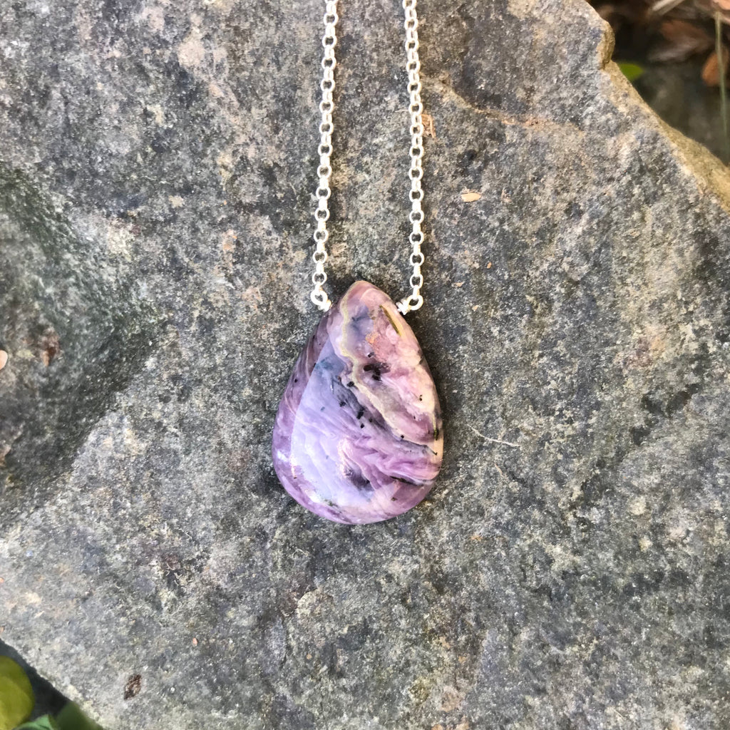 The Charoite Drop Sterling Silver Necklace features a gorgeous had polished stone. Each stone is hand carved so expect variation in color and inclusions and slight variation in shape and size.  The Charoite in the photographs is 22mm tall by 15mm wide by 5mm thick.  The Amazonite suspends from 16 inches of sterling silver rolo chain with lobster clasp and closure.  You can purchase more chain length, up to 24 inches, and completely customize your necklace.