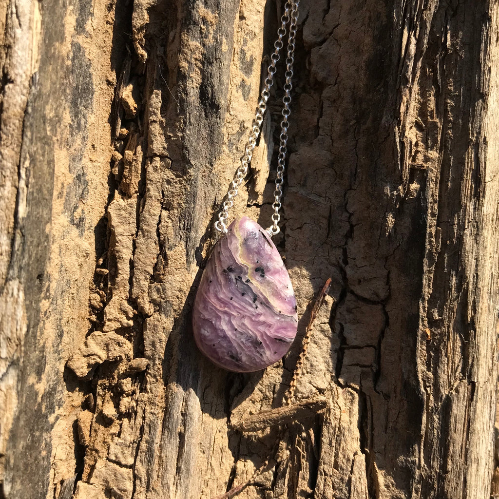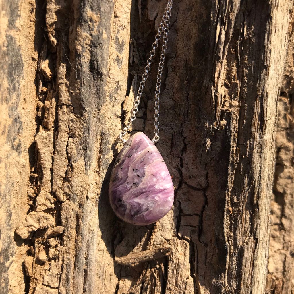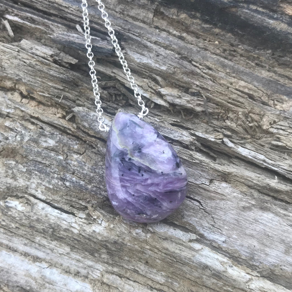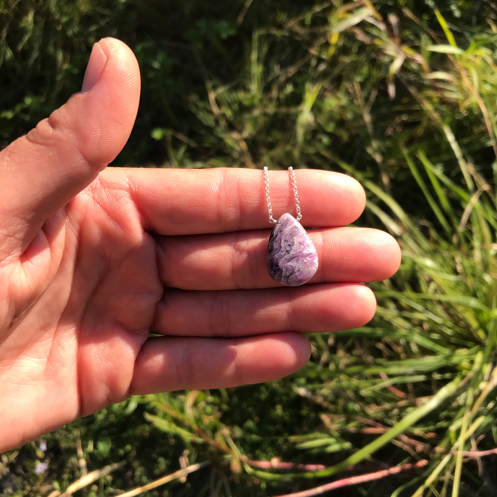 The Charoite Drop Sterling Silver Necklace features a gorgeous had polished stone. Each stone is hand carved so expect variation in color and inclusions and slight variation in shape and size.  The Charoite in the photographs is 22mm tall by 15mm wide by 5mm thick.  The Amazonite suspends from 16 inches of sterling silver rolo chain with lobster clasp and closure.  You can purchase more chain length, up to 24 inches, and completely customize your necklace.