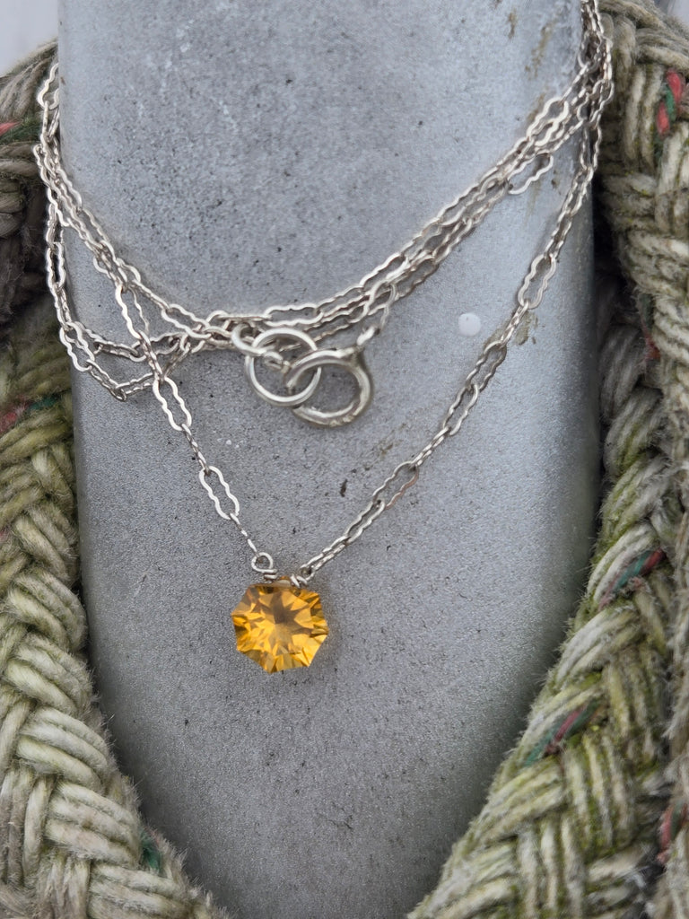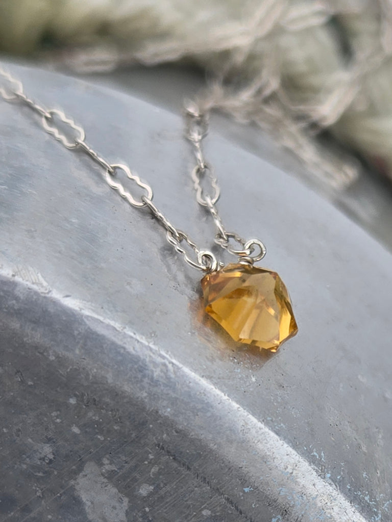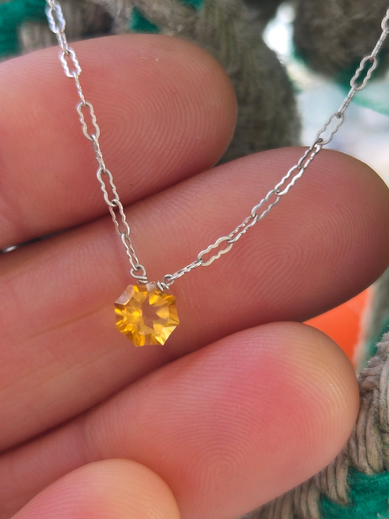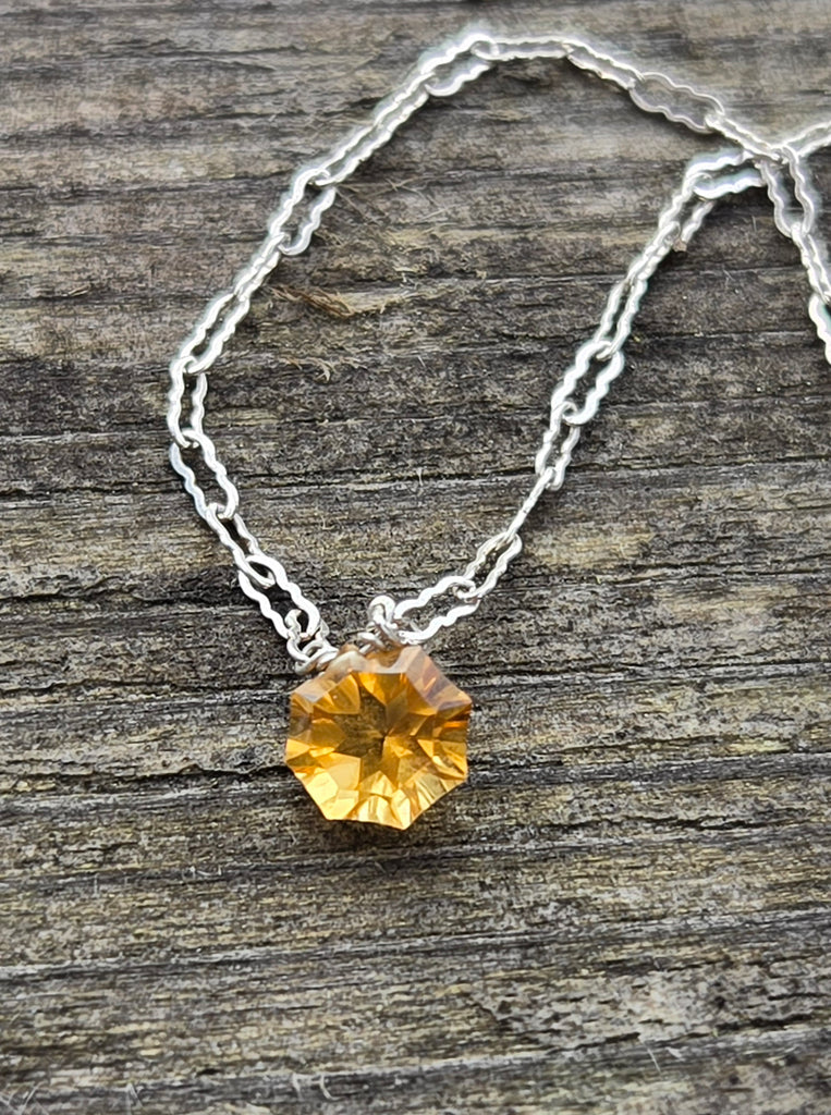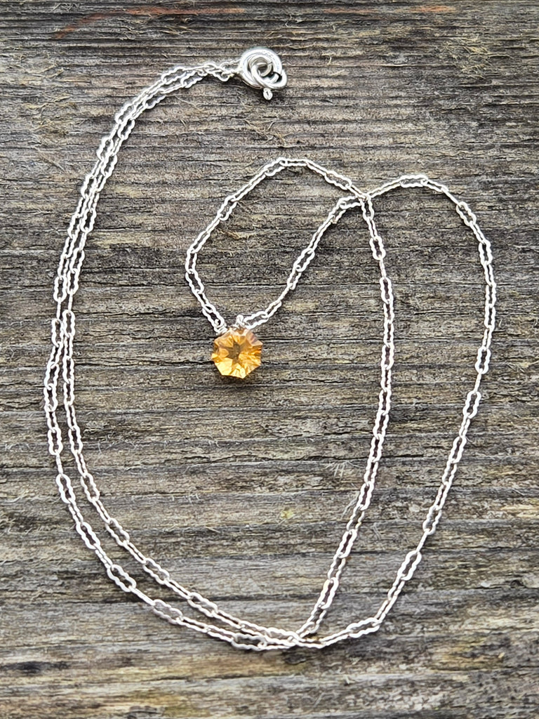 The Citrine Fantasy Faceted Sterling Silver Necklace features an all natural gemstone. The Citrine carving is reminiscent of a sunflower.  The Citrines average around 4mm long by 4mm wide and 2 -3 mm thick. The Sterling silver chain in these photos is called "krinkle chain", and the necklace can be ordered in 16 or 18 inches long for the same price.