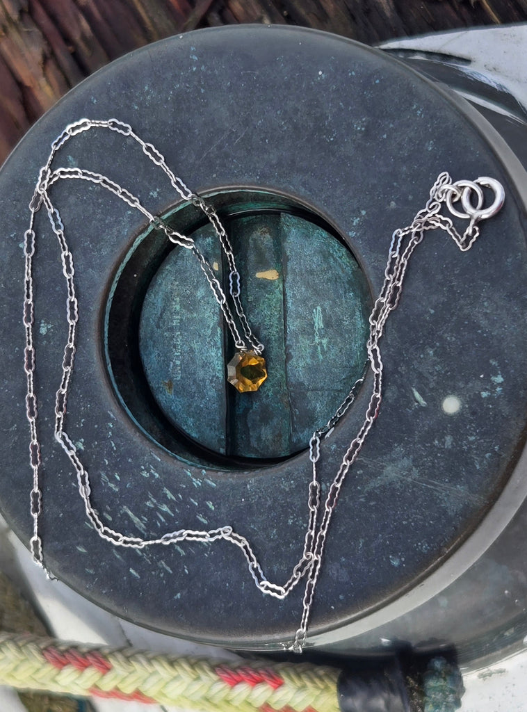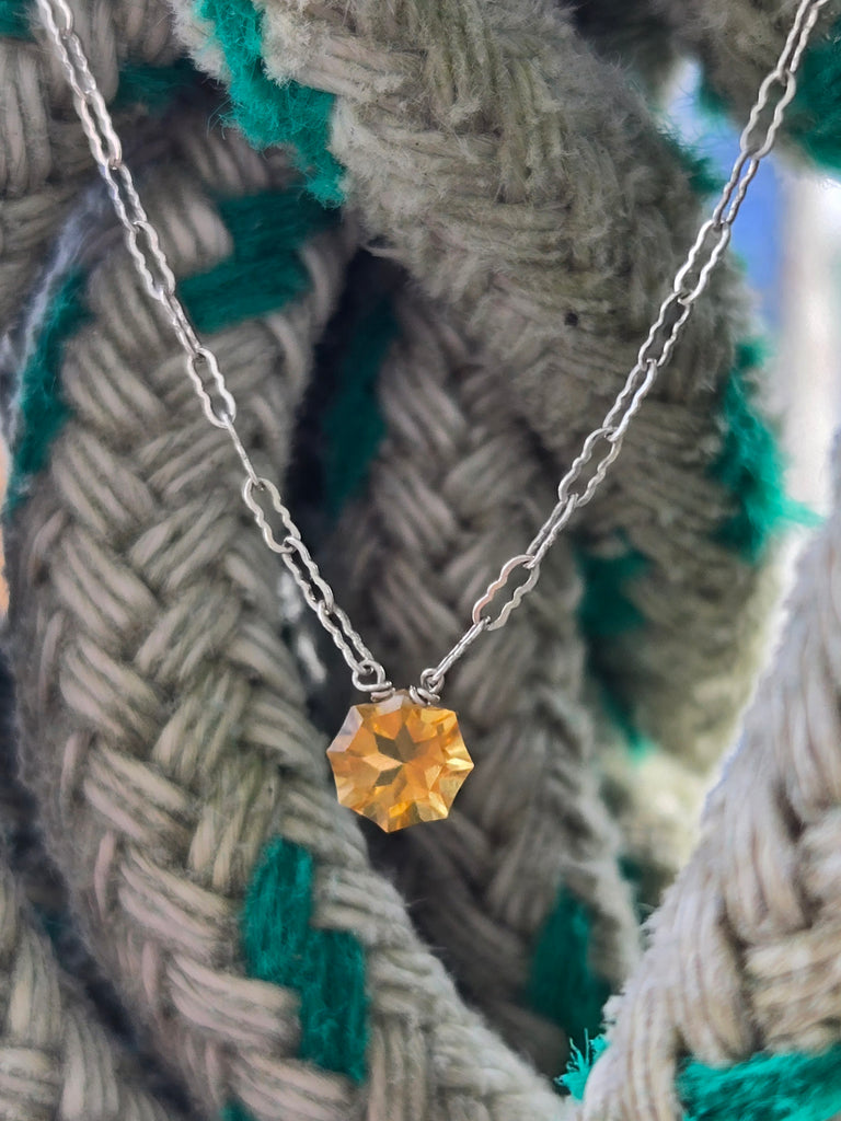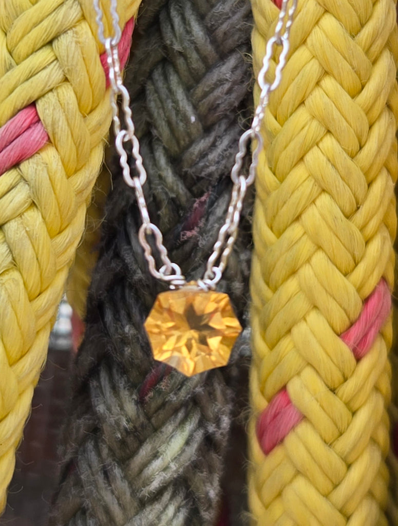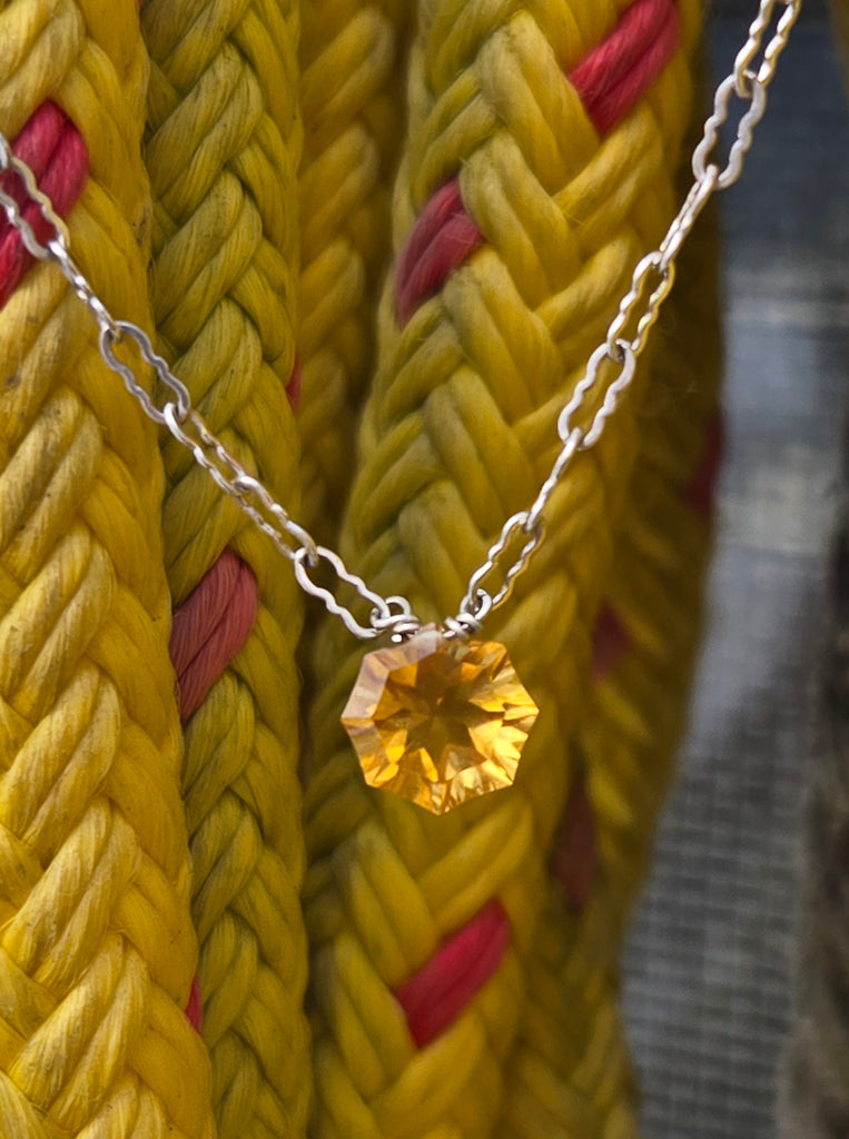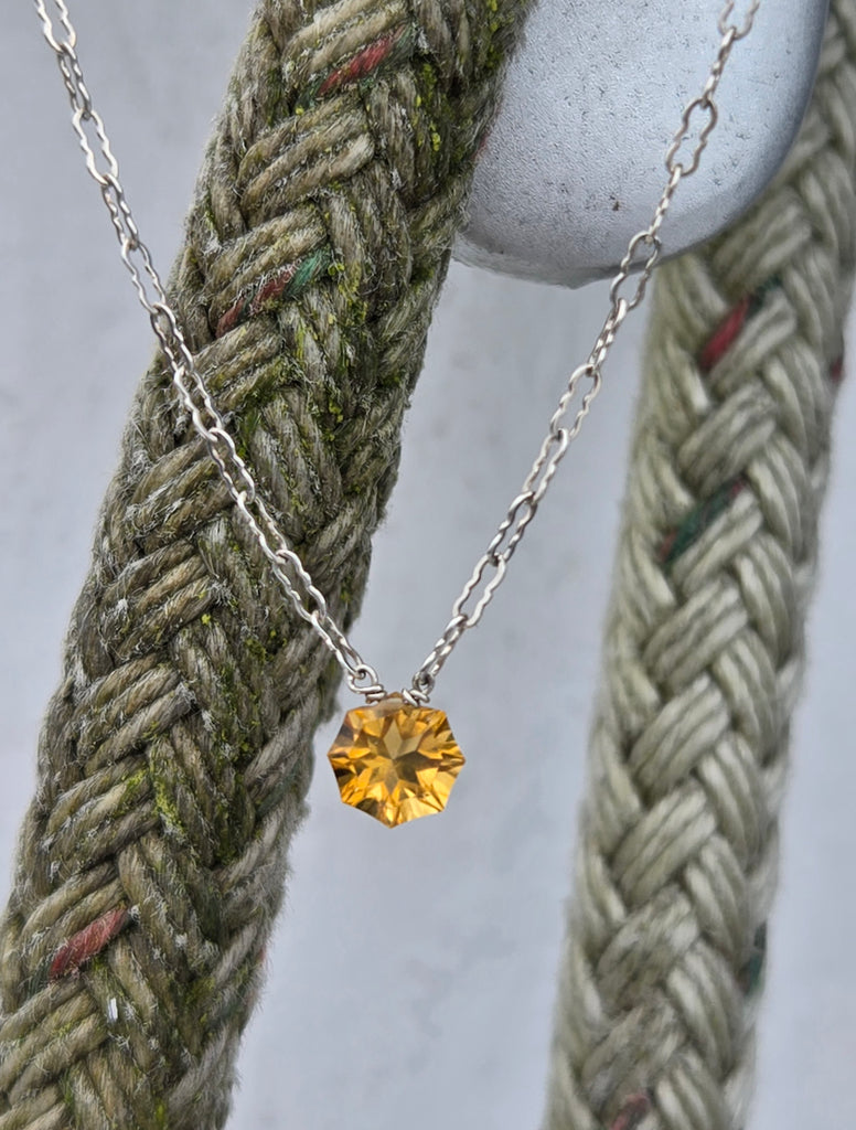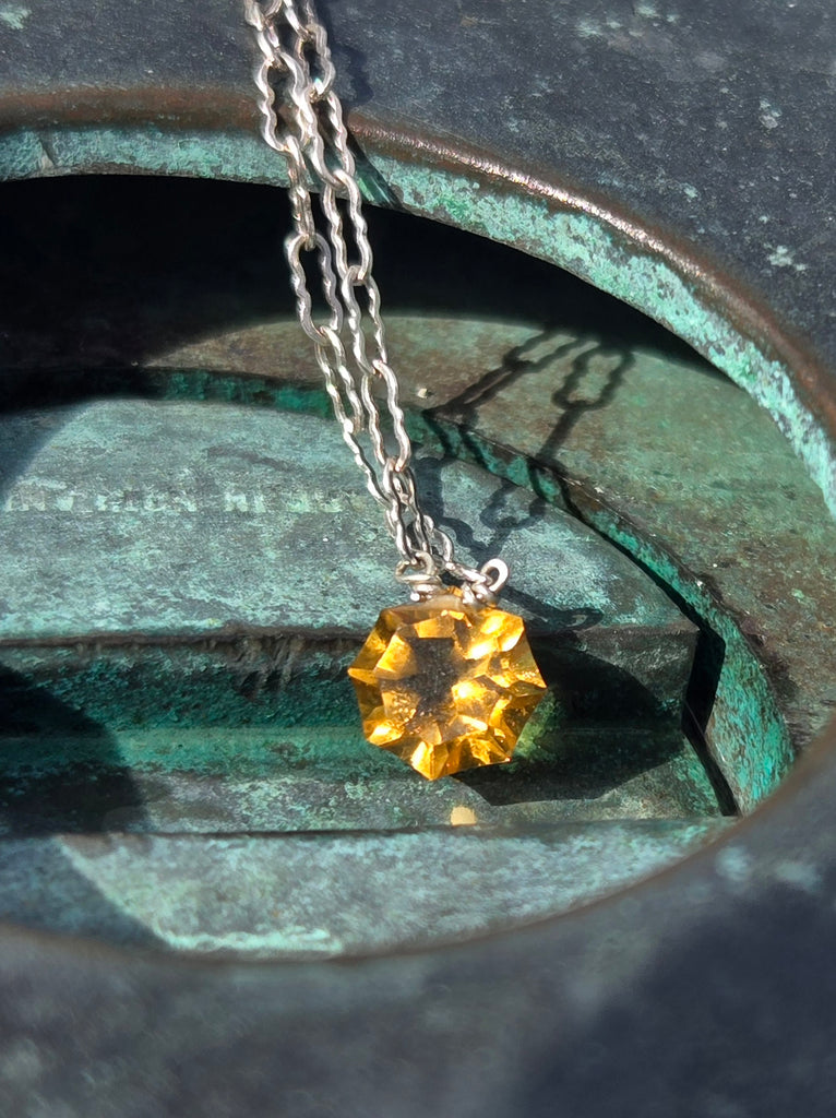 The Citrine Fantasy Faceted Sterling Silver Necklace features an all natural gemstone. The Citrine carving is reminiscent of a sunflower.  The Citrines average around 4mm long by 4mm wide and 2 -3 mm thick. The Sterling silver chain in these photos is called "krinkle chain", and the necklace can be ordered in 16 or 18 inches long for the same price.