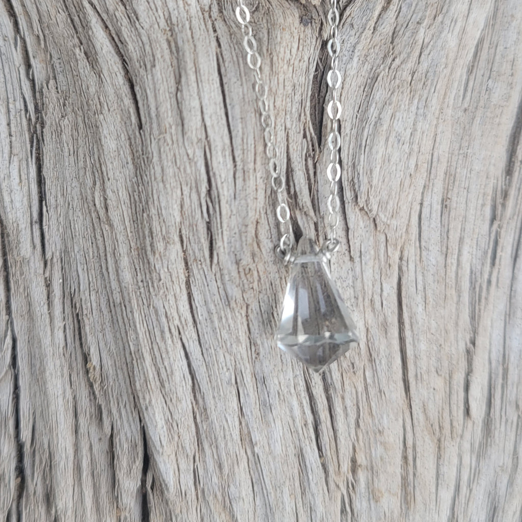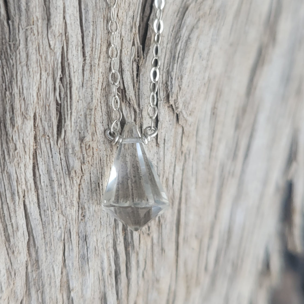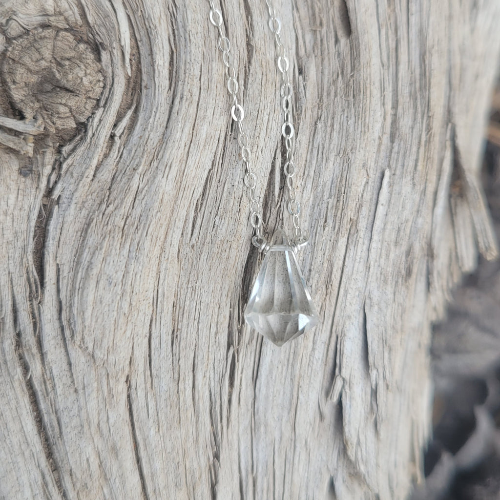 The Clear Quartz Sterling Silver Necklace features a beautifully faceted stone. It suspends from 16 or 18 inches of sterling silver chain with spring clasp and closure.  The necklace in the photograph is on the Cable chain.  It's the daintiest option at 1.08mm, which is why its cheaper.  It is sturdy, but if you're hard on your jewelry, I would recommend any of the other chain options.
