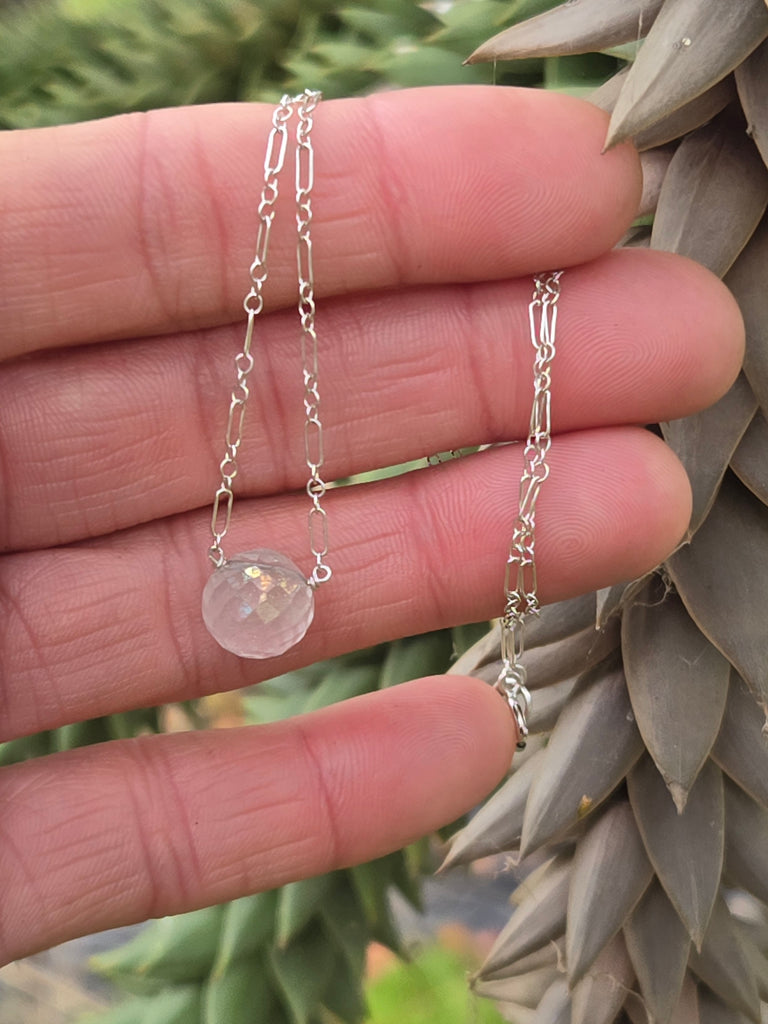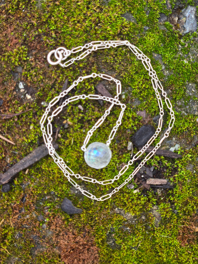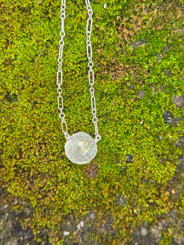 The Labyrinth Faceted Crystal Ball Sterling Silver Necklace features an all natural gemstone lightly coated with titanium electroplating. The faceted clear quartz spheres average around 12-13mm in diameter. The sterling silver chain in these photos is called "3 and 1 chain", and the necklace can be ordered in 16 or 18 inches long for the same price.