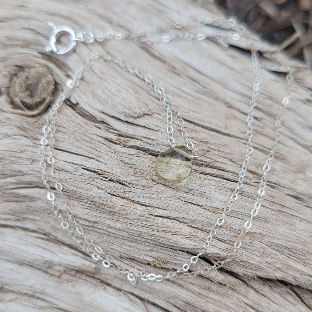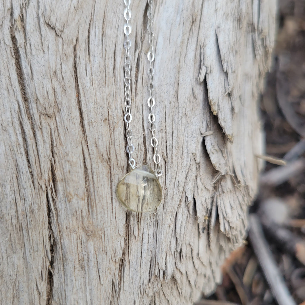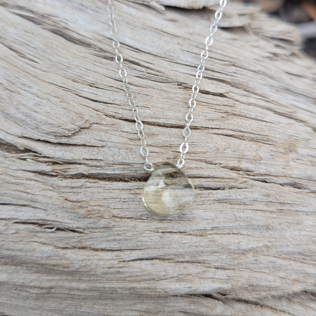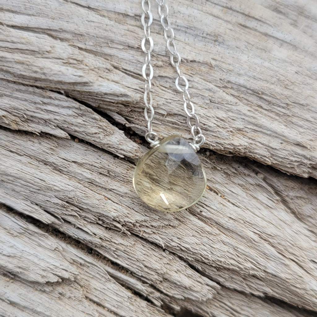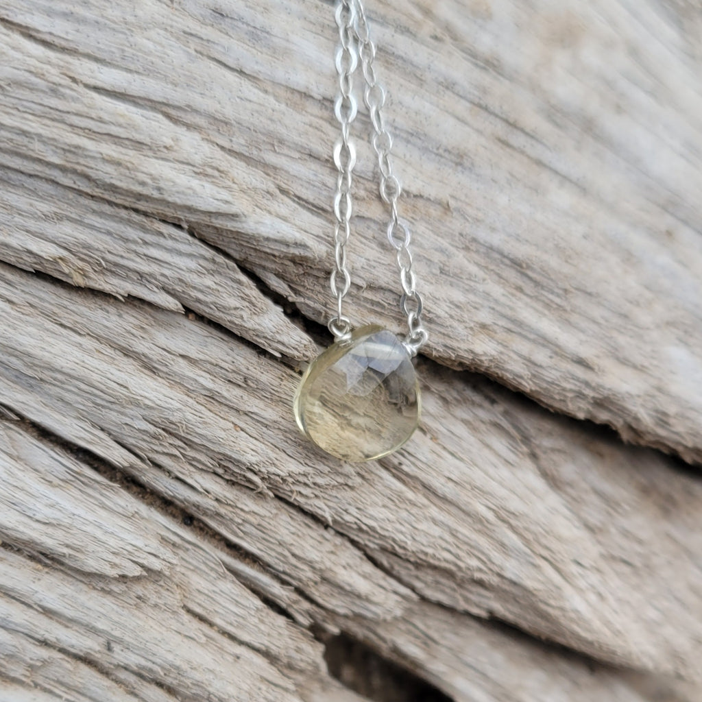 A faceted Lemon Quartz briolette suspends from 16 inches of dainty yet sturdy sterling silver cable chain. A spring clasp and closure finish the necklace.