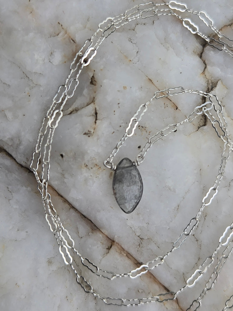 The Moss Aquamarine Faceted Marquise Sterling Silver Necklace features an all natural gemstone. The Moss Aquamarine average around 6mm long by 2mm thick. Unlike other Aquamarine, Moss Aquamarine has inclusions of another stone called, "Ilmenite", which occur as black lines and specks within the Aquamarine. They create the Moss like appearance from which the stone is named. If the stone is heavily included with Ilmenite, it becomes knows as, "Black Rain Aquamarine". Please note that each Moss Aquamarine is unique in inclusions, some are more saturated with Ilmenite than others. If you have a preference the amount of inclusion, please email me at gigimoongems@gmail.com after you place your order, and I will accommodate your request.