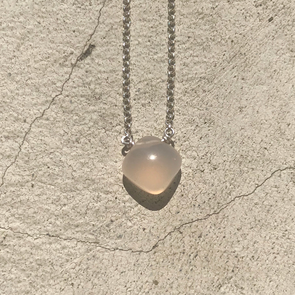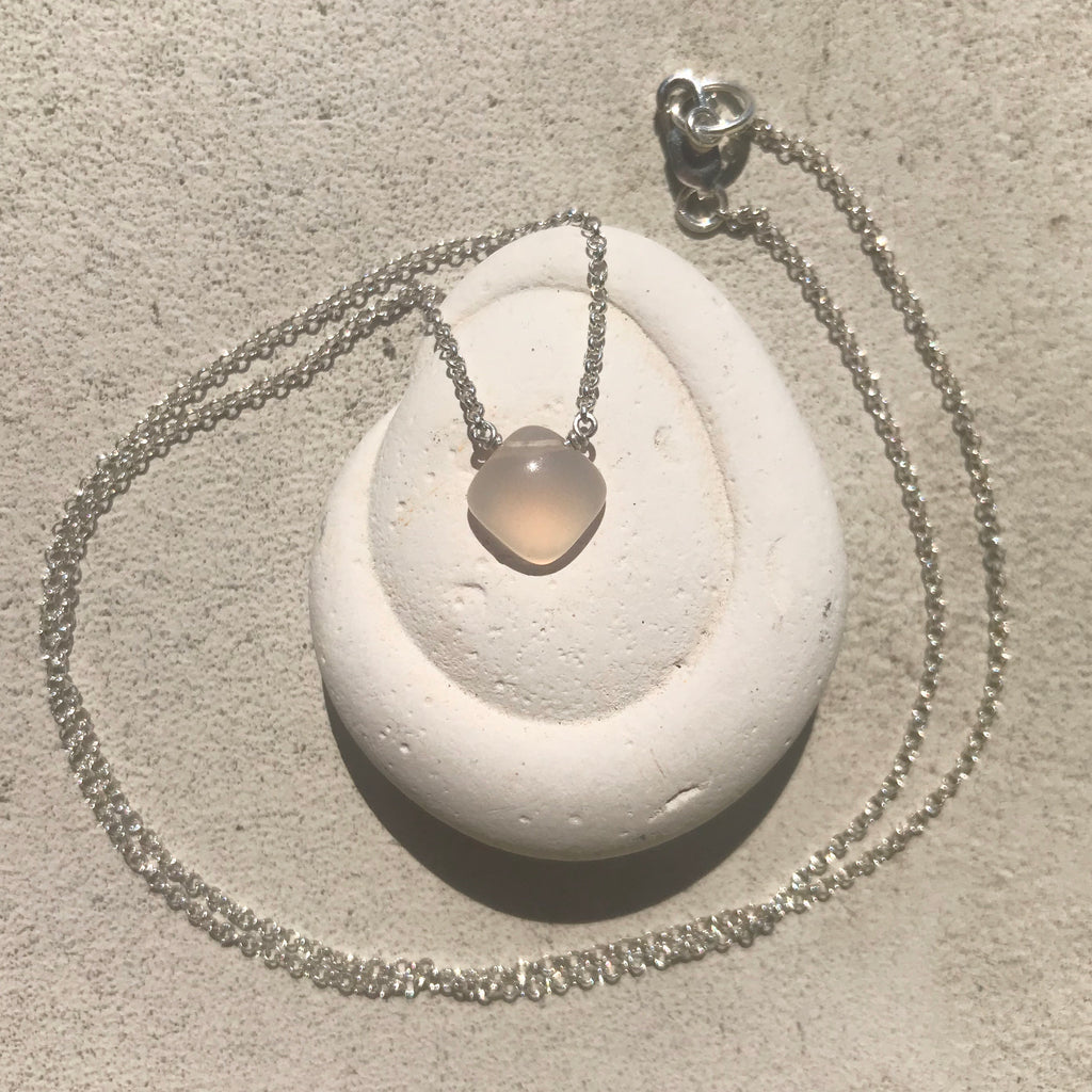 The Pink Chalcedony Necklace features a gorgeously carved drop.  It suspends from 16 inches of sterling silver chain with lobster clasp and closure.  Each stone varies slightly in shape and pattern but all look similar to the one in the photo.