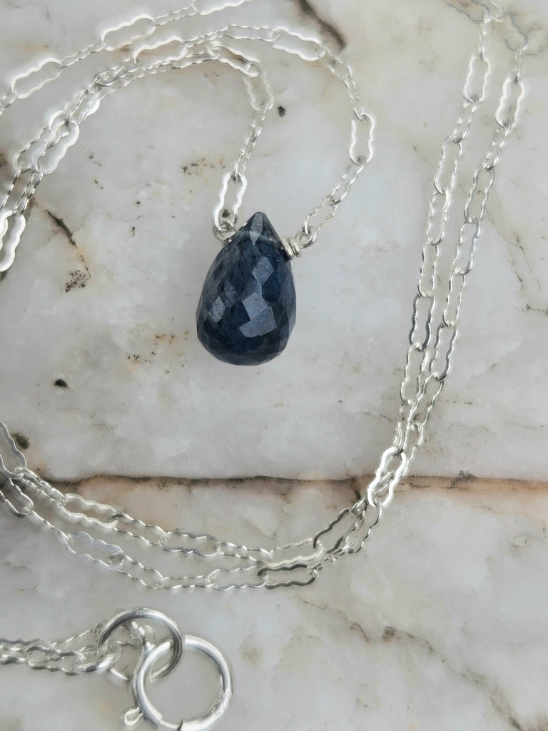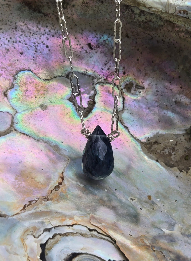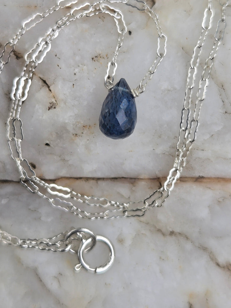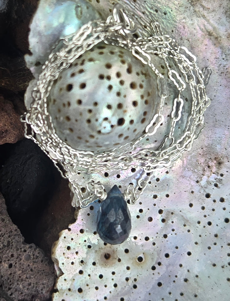 The Teal Apatite Faceted Briolette Sterling Silver Necklace features an all natural gemstone. The Teal Apatite Briolettes average around 6mm long by 4mm wide. The sterling silver chain in these photos is called "krinkle chain", and the necklace can be ordered in 16 or 18 inches long for the same price.