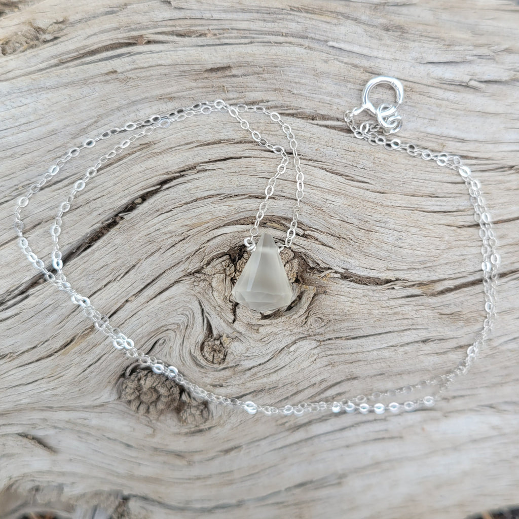 A gorgeous White Catseye faceted gemstone is the center piece of this necklace. It suspends from 16 inches of sterling silver chain with matching spring clasp and closure.