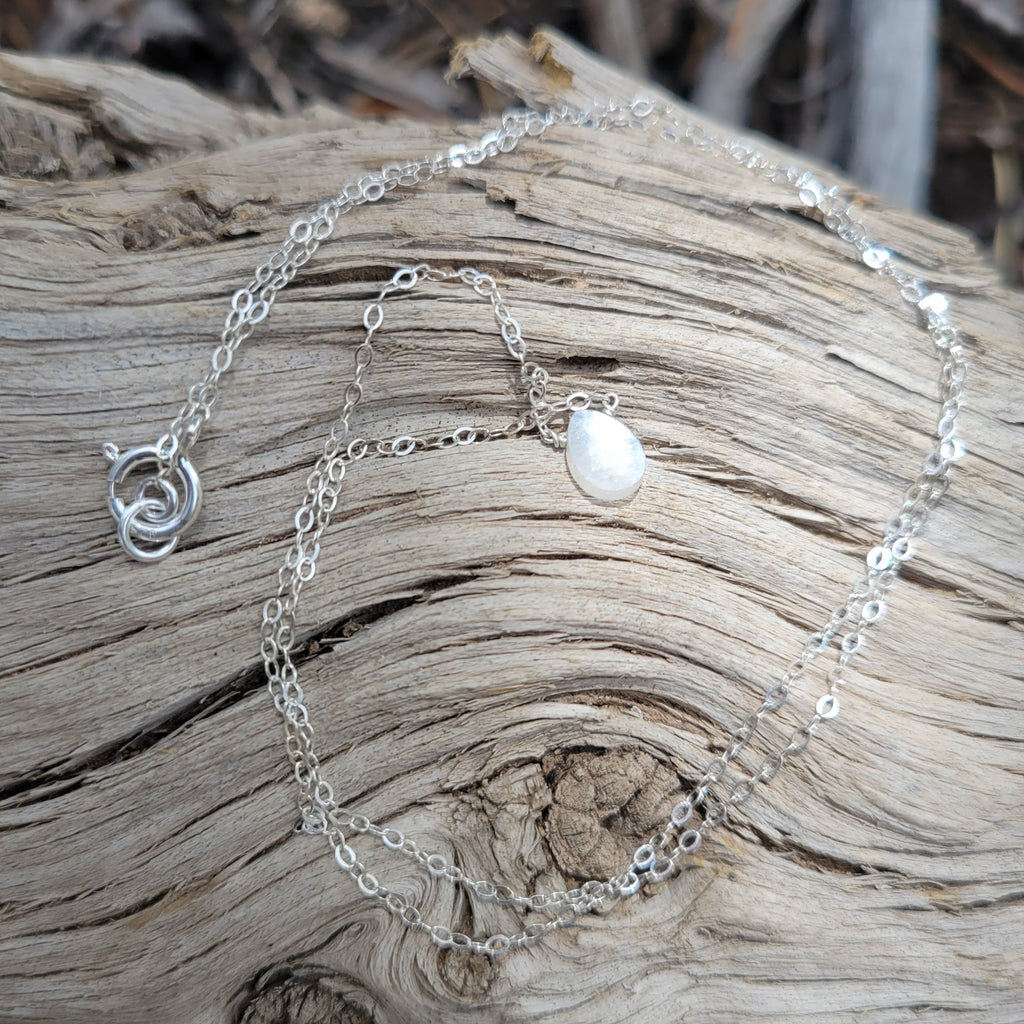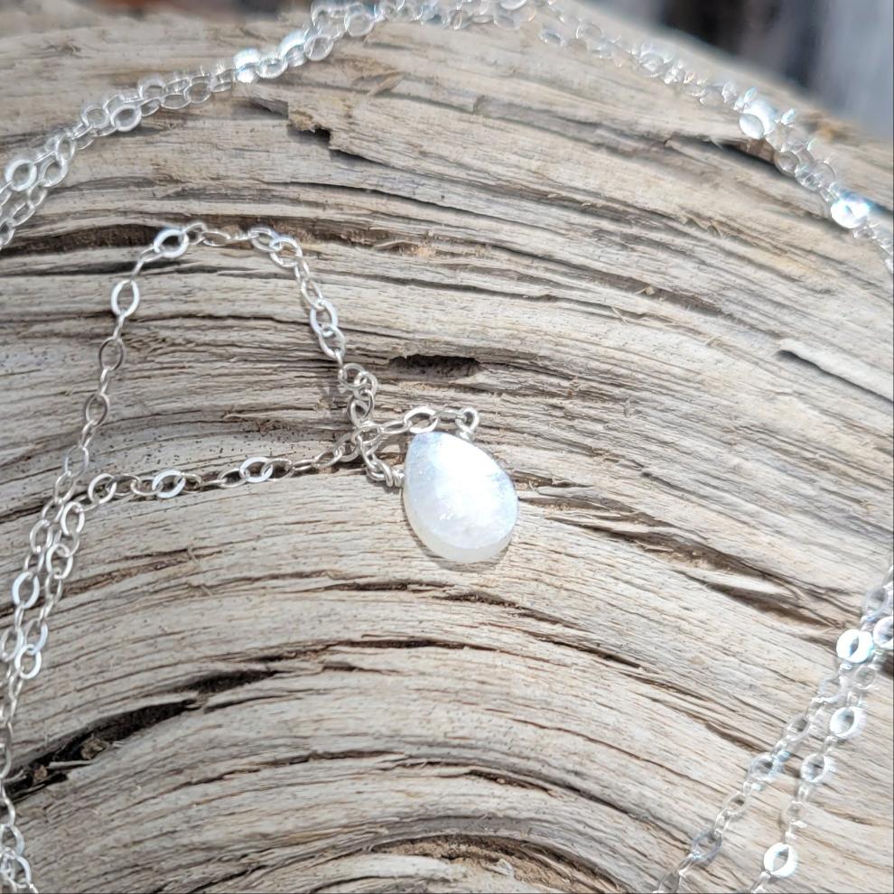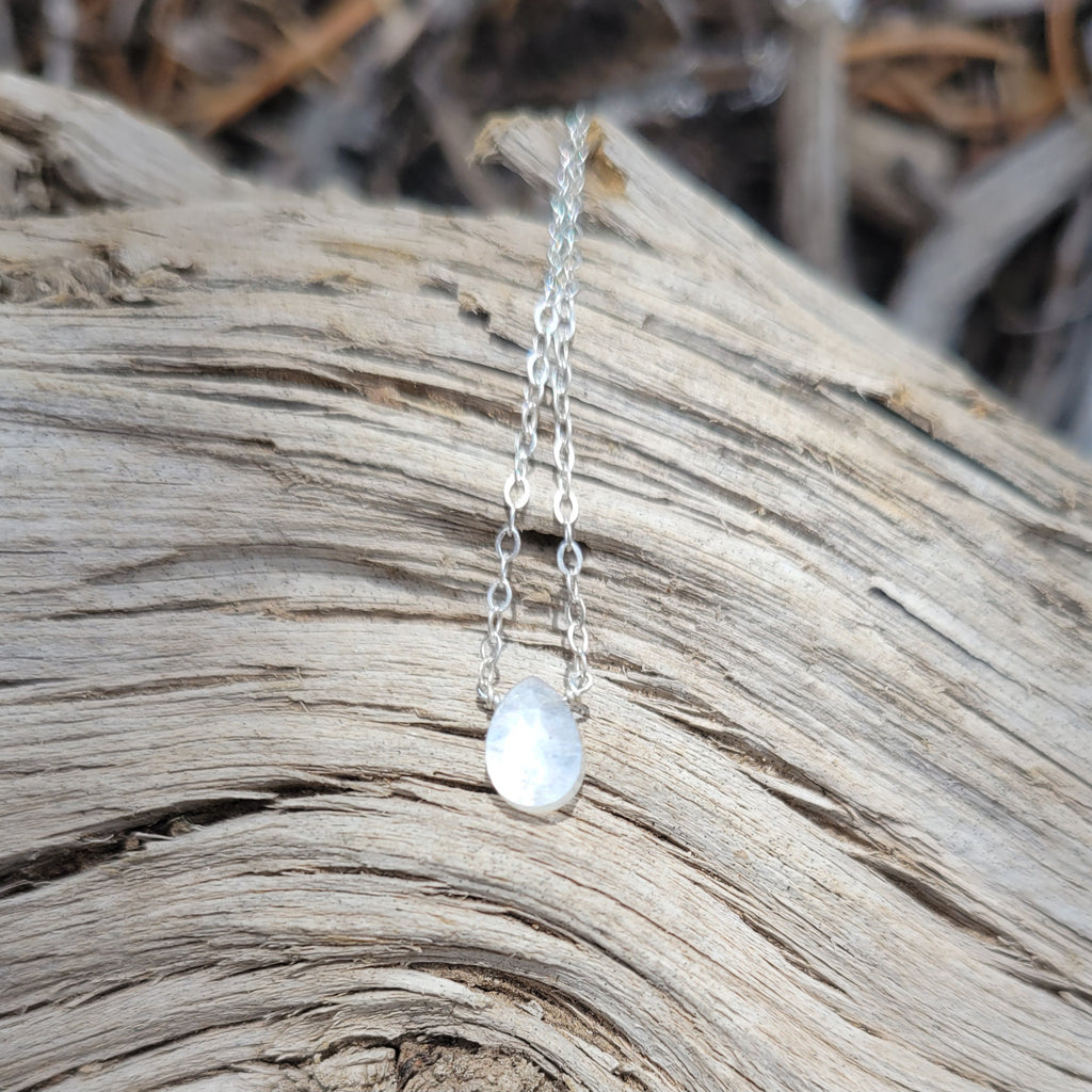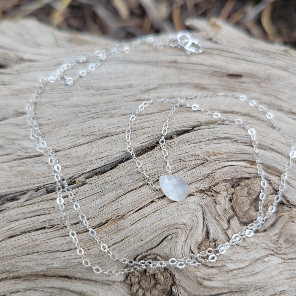 A dainty faceted white briolette is the center piece of this necklace. It suspends from 16 inches of sterling silver chain with matching spring clasp and closure.