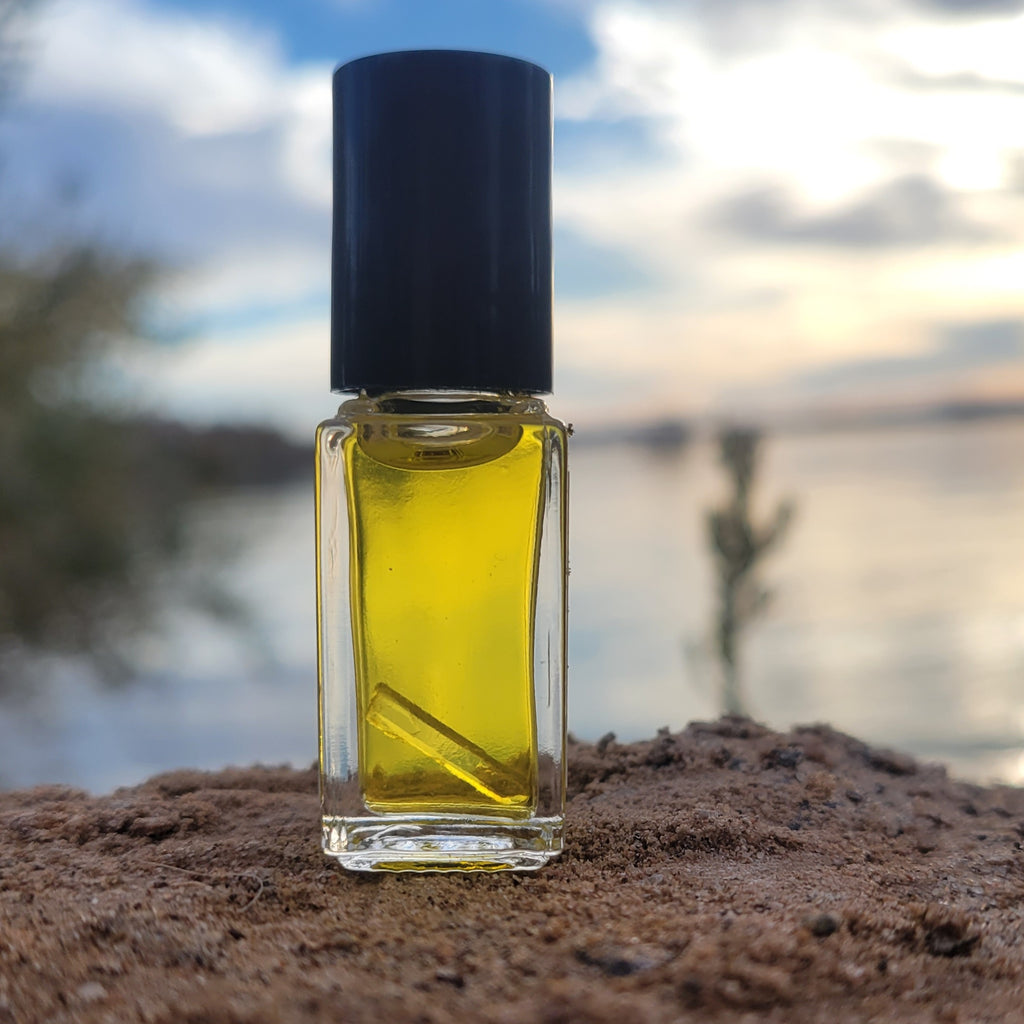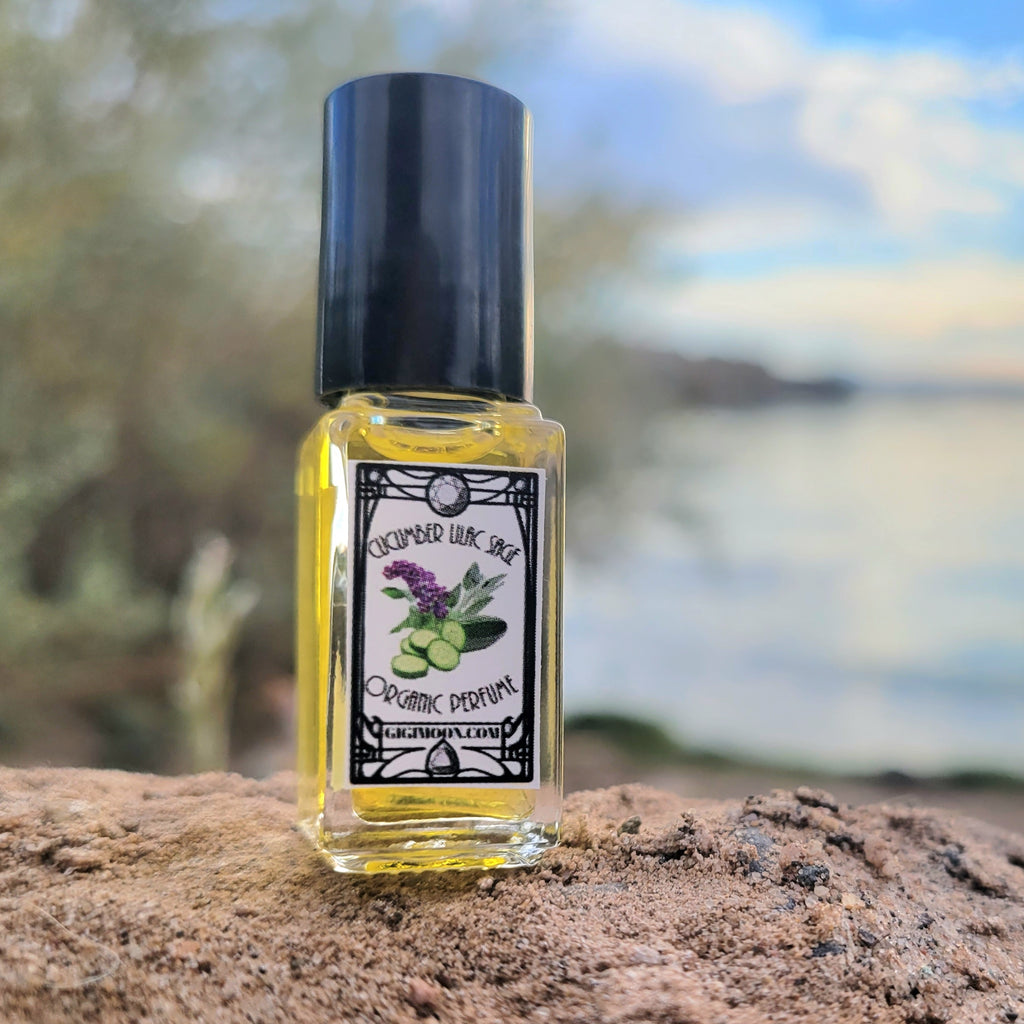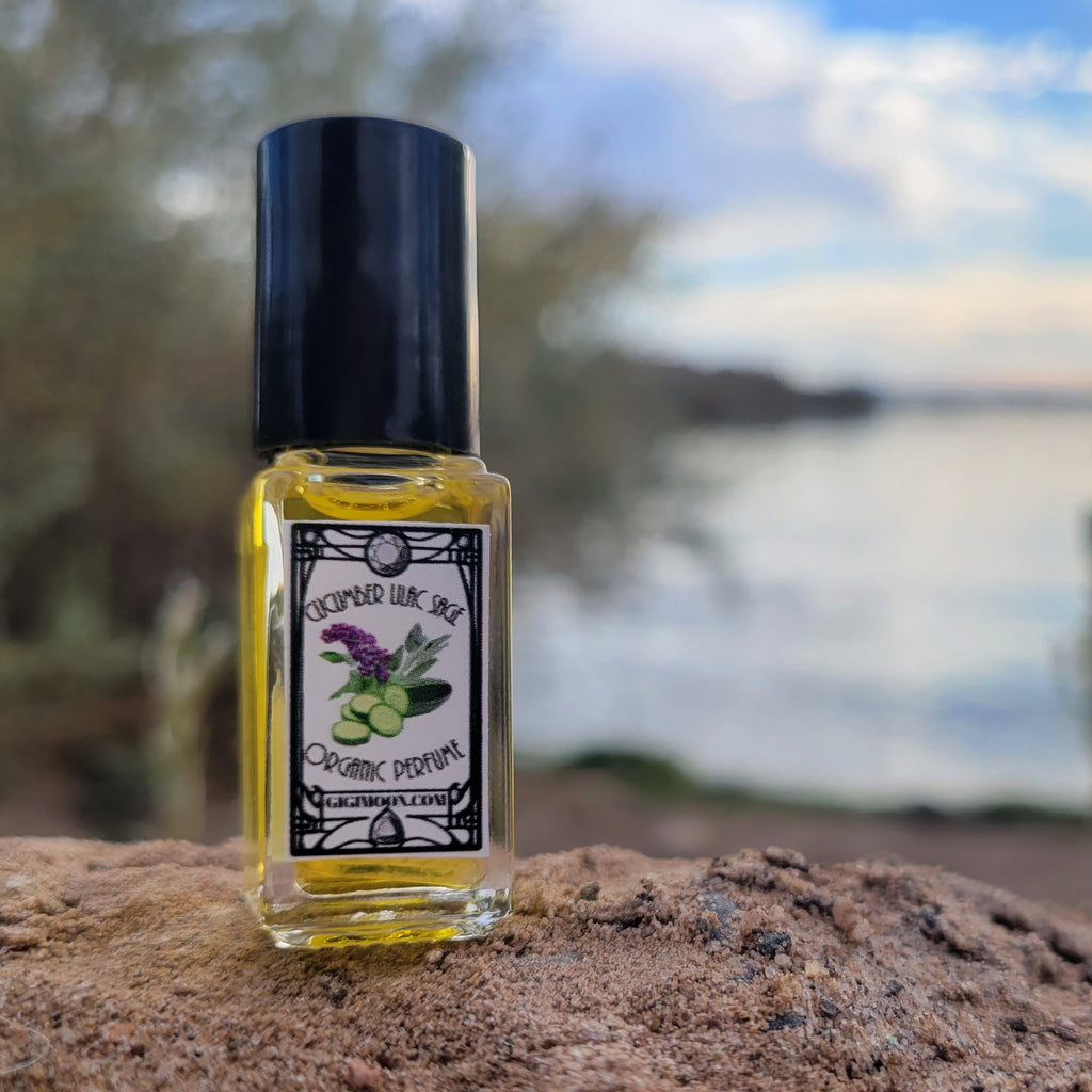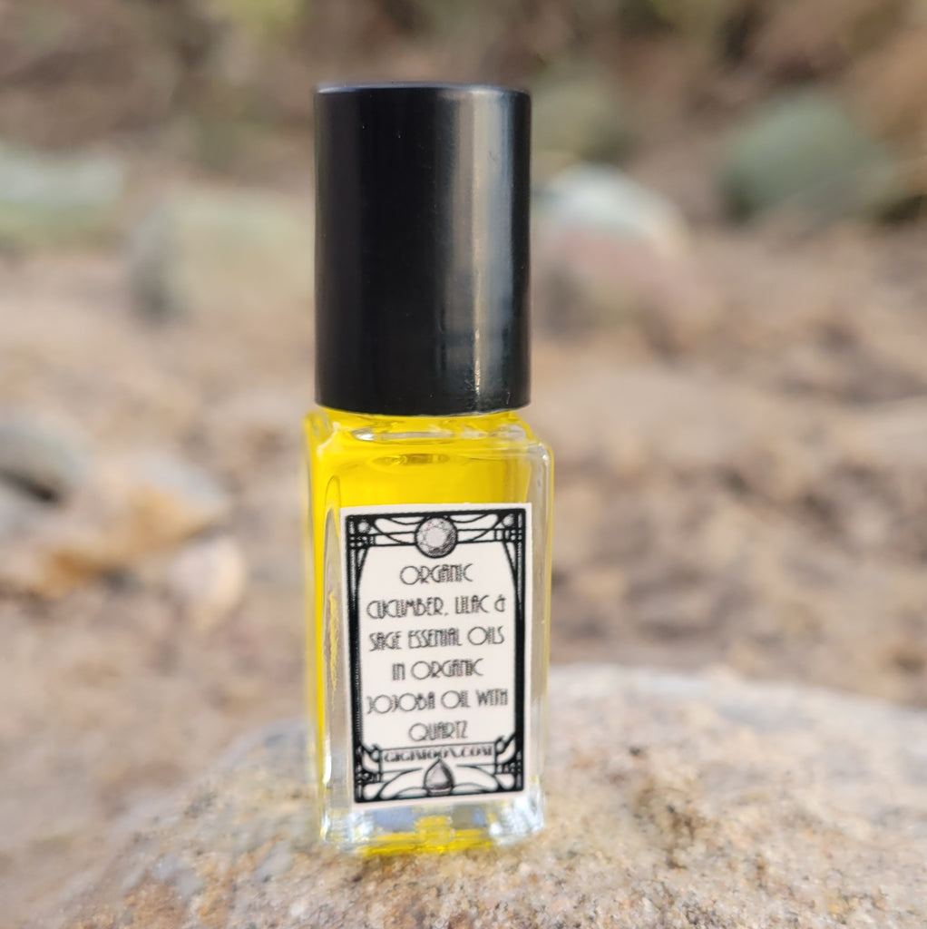 Cucumber Lilac Sage Organic Perfume is an essential oil blend suspended in organic jojoba oil. The perfume comes in a 3ml sized bottle with a roll on ball applicator. Cucumber Lilac Sage is made with all 3 organic essential oils in its name. Each bottle has a clear quartz crystal point suspended inside the blend.