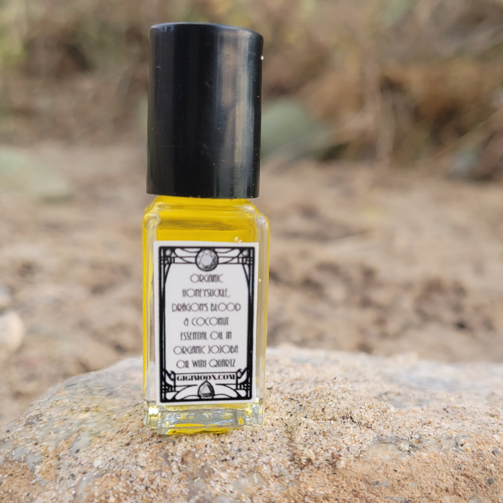 Honeysuckle Organic Perfume is an essential oil blend suspended in organic jojoba oil.  The perfume comes in a 3ml sized bottle with a roll on ball applicator.  Honeysuckle Perfume is made with Honeysuckle, Dragon's Blood and Coconut organic essential oils.  Each bottle has a clear quartz crystal point suspended inside the blend.