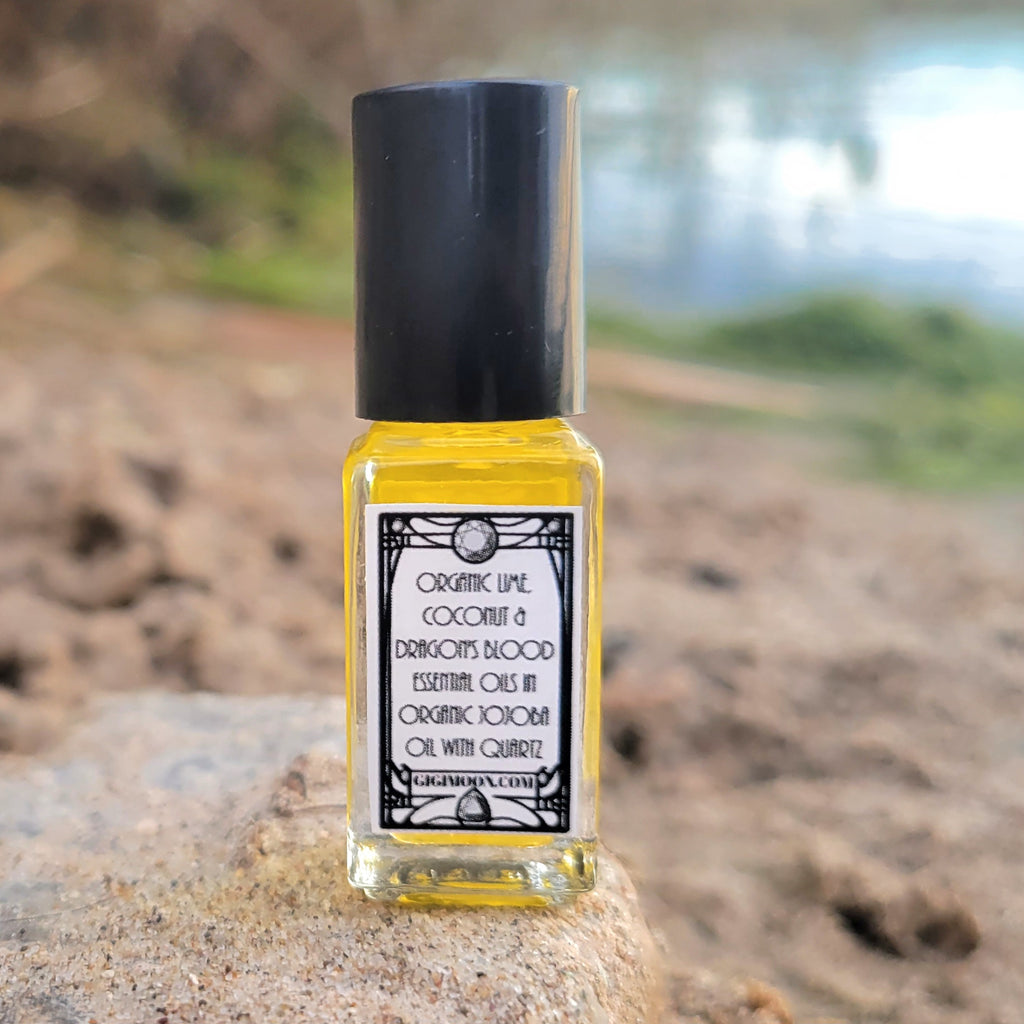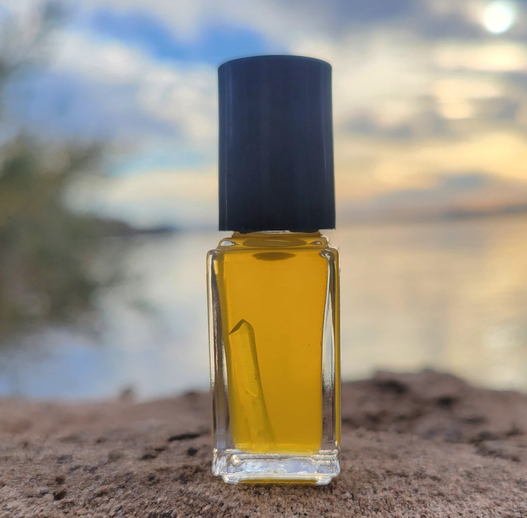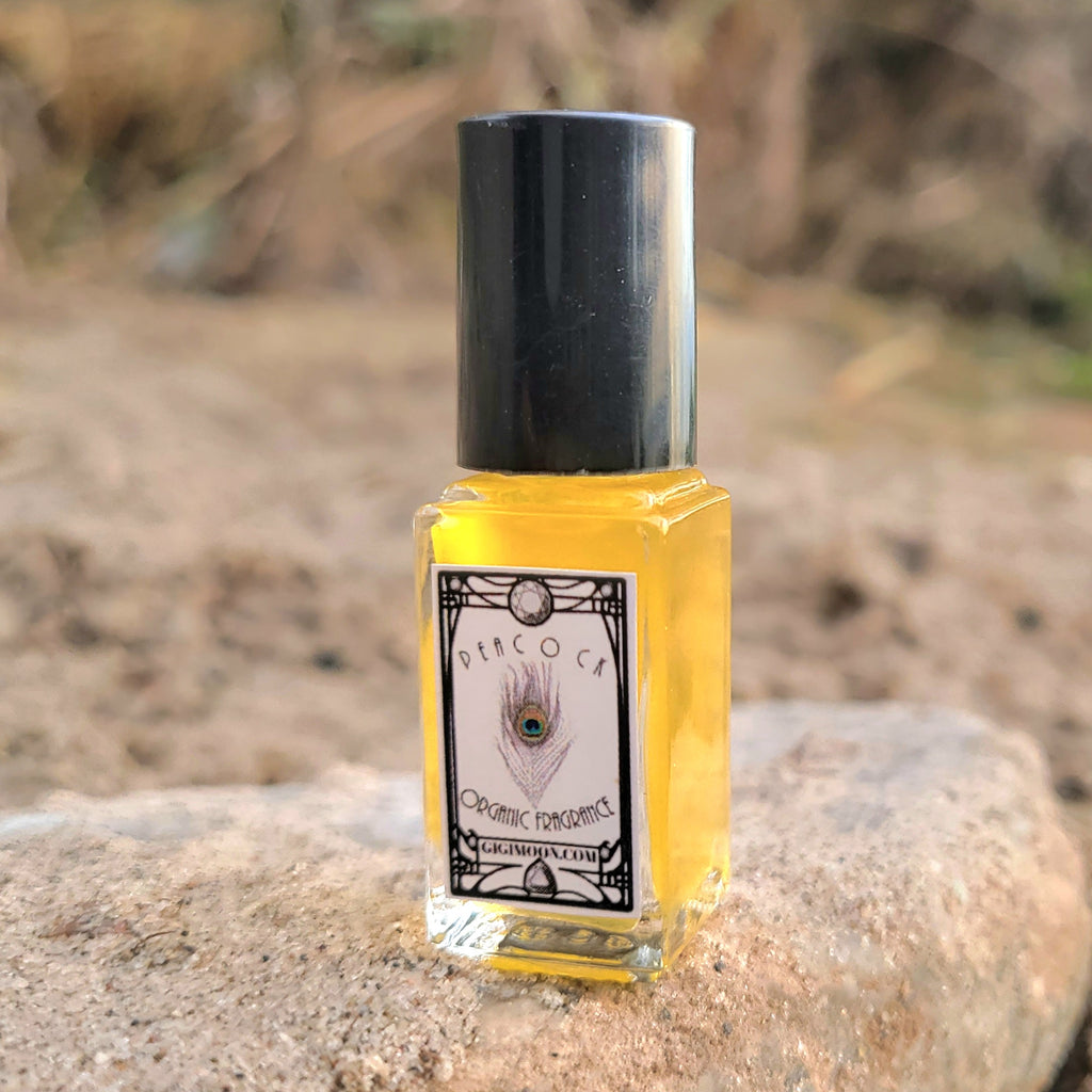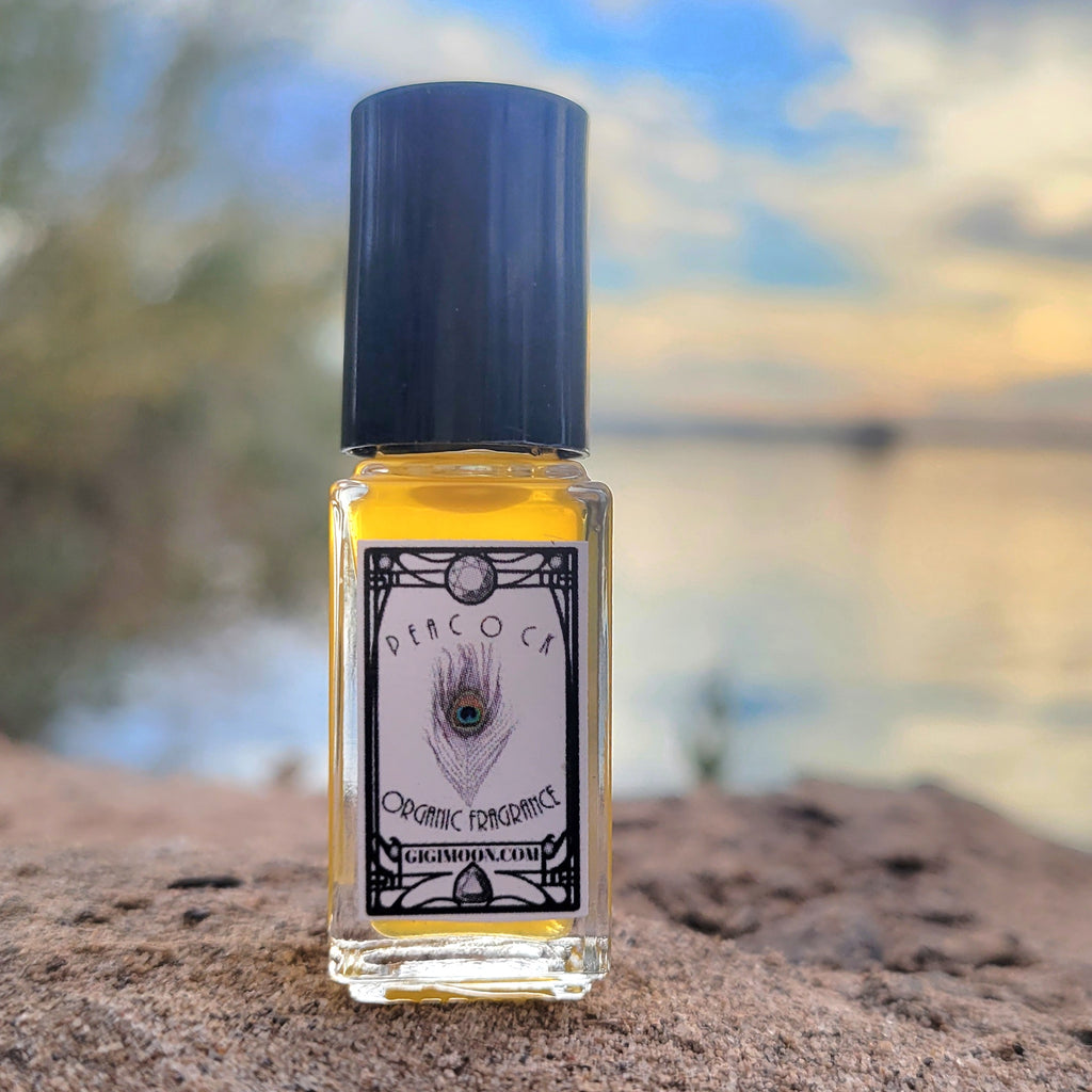 Peacock Organic Fragrance is an essential oil blend suspended in organic jojoba oil. The perfume comes in a 3ml sized bottle with a roll on ball applicator.  Peacock is made with Cocoa, Dragon's Blood, Sandalwood and Sage organic essential oils. Each bottle has a clear quartz crystal point suspended inside the blend.