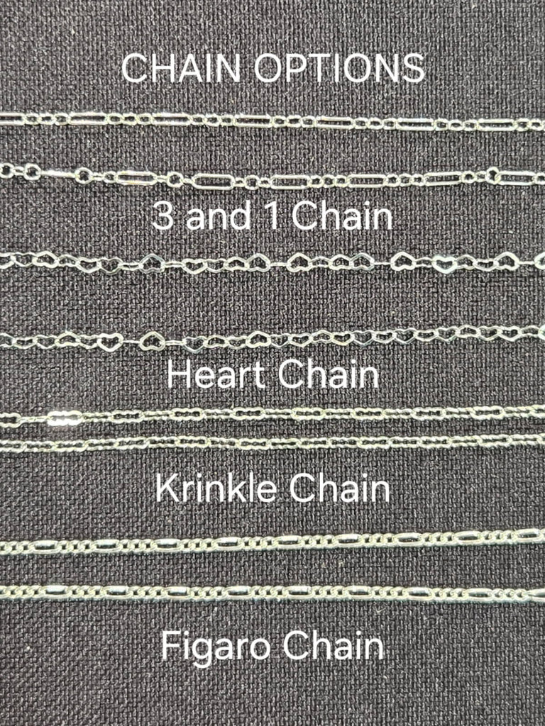 Refer to the last photograph to see the options. You can select your chain length and type. Each chain is .925 Sterling Silver, which is hypoallergenic.
