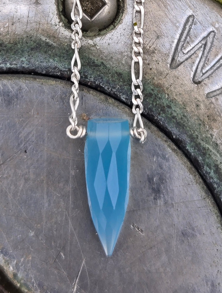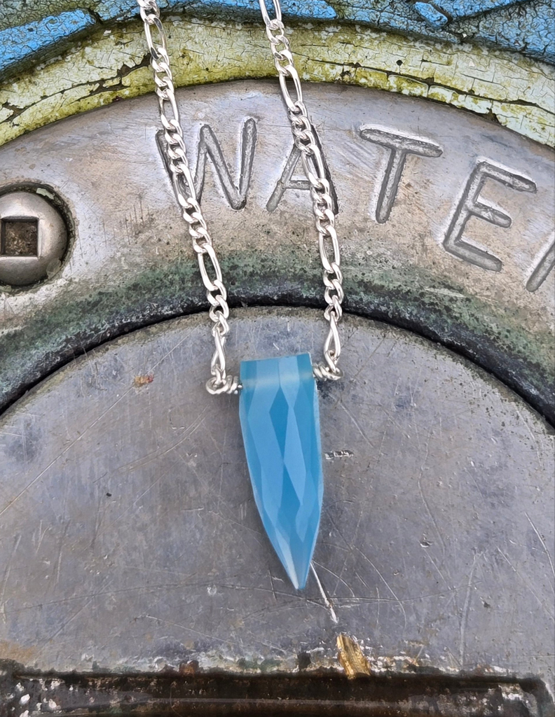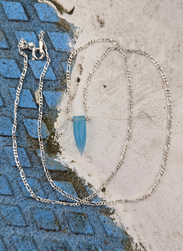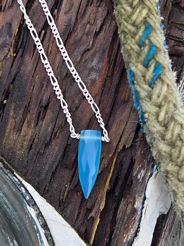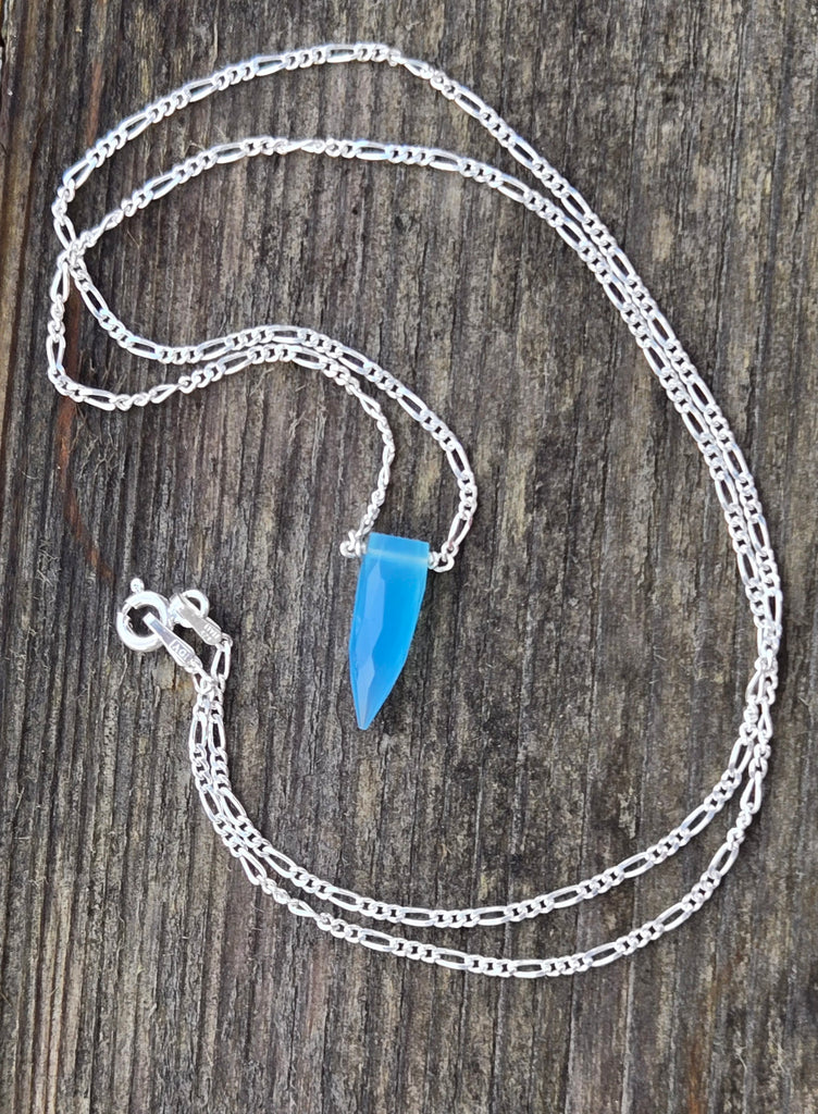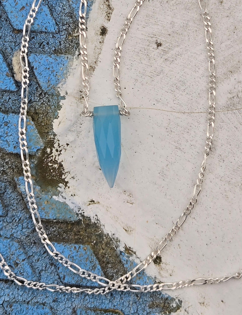 The Blue Chalcedony Faceted Bullet Sterling Silver Necklace features an all natural gemstone. The Blue Chalcedony average around 7mm long by 3mm wide. The Sterling silver chain in these photos is called, "figaro chain", and the necklace can be ordered in 16 or 18 inches long for the same price.