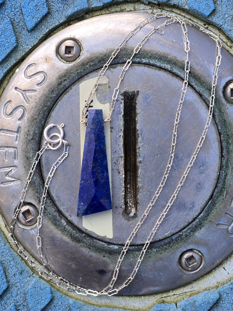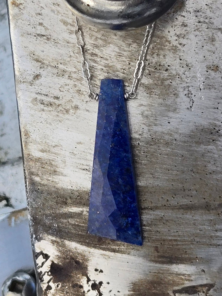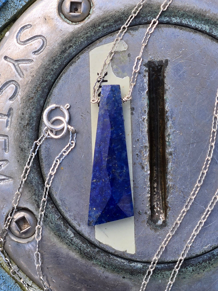 The Lapis Lazuli Faceted Drop Sterling Silver Necklace features an all natural gemstone. The Lapis Lazuli are all carved in the same shape but they're unique in inclusions. Some have more pyrite and sodalite than others. They're faceted on both sides and can be worn either way. The Lapis Lazuli average around 25mm long by 10mm wide and 1 - 2mm thick. The sterling silver chain in these photos is called "krinkle chain", and the necklace can be ordered in 16 or 18 inches long for the same price.